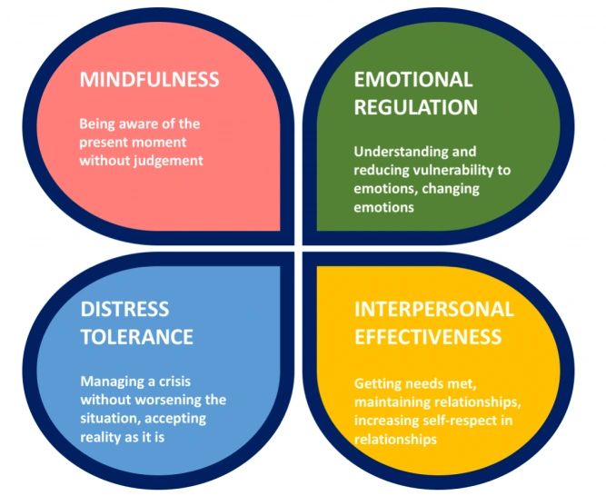Dialectical Behaviour Therapy (DBT) is a gentle approach that helps you find balance in your thinking styles, emotional experiences and relationships so that you can begin to feel more in control of your life. To help us get there, DBT focuses on 4 main areas: