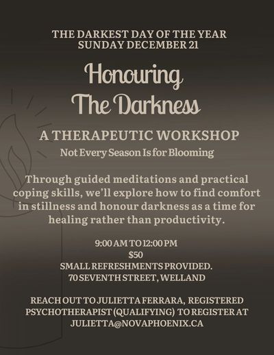 Come join us on December 21st to honour the darkest day of the year and learn useful coping skills that can teach you how to rest in stillness and practice healing during the cold dark days of winter.